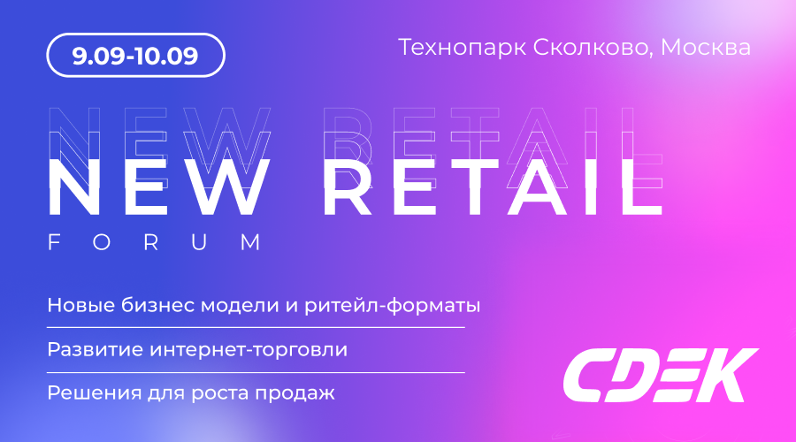 Приглашаем на New Retail Forum, 9-10 сентября 2021 года. Представители CDEK примут участие в двух ключевых конференциях форума - «Стратегии развития продаж на маркетплейсах» и «Логистика, склад, фулфилмент».
