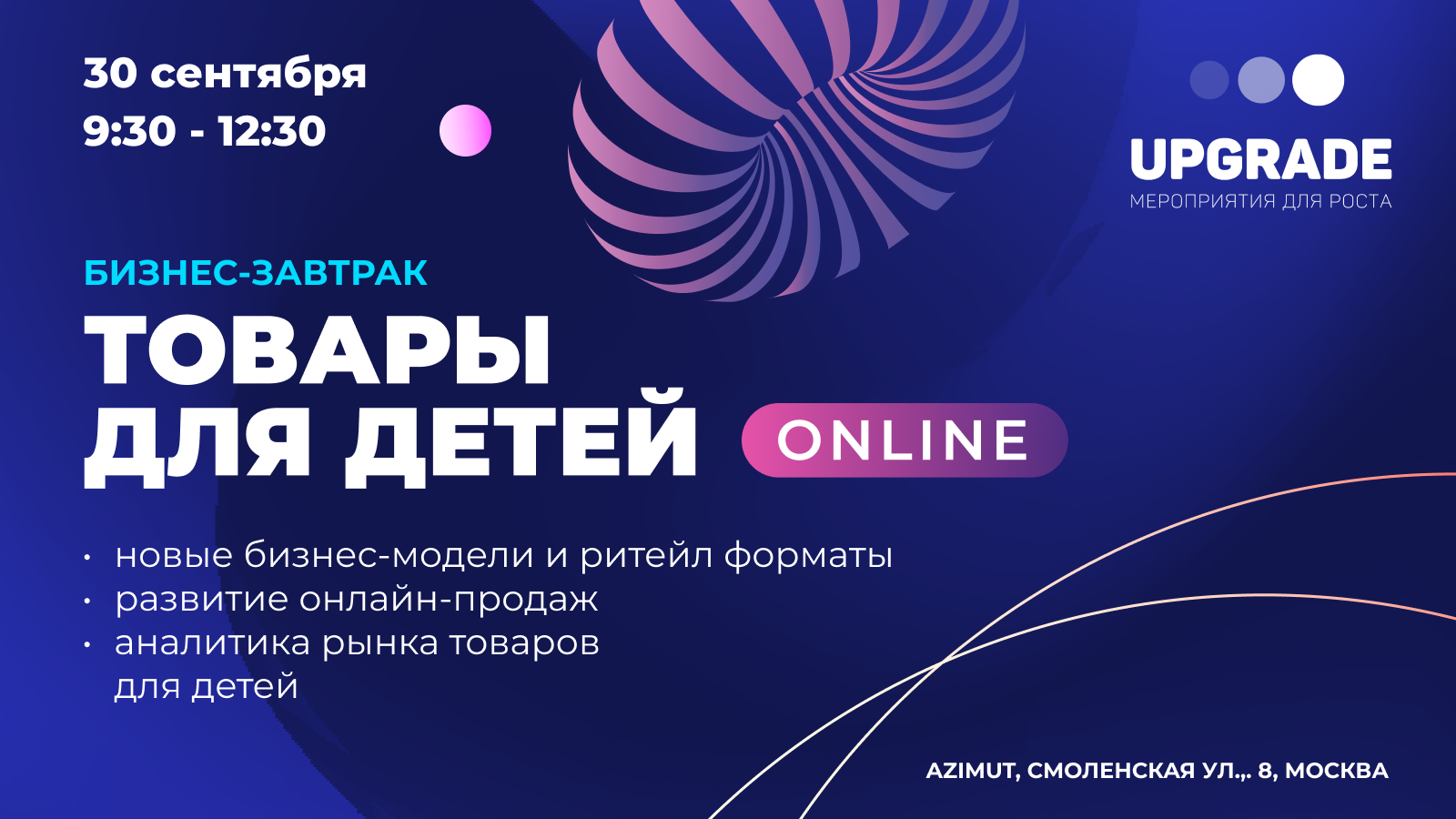 | UPGRADE | Деловые мероприятия для ритейлеров | | | Друзья, коллеги! Приглашаем на бизнес-завтрак UPGRADE: товары для детей, 30 сентября 9:30-12:30, Азимут, Смоленская, 8. | | | | Спикеры ответят на ваши вопросы: | | | | | Иван Ивушкин | | руководитель маркетплейса Детский мир | | | | Игорь Татаренко | | директор департамента Товарный каталог и контент компании "Дочки-сыночки" | | | | Ольга Тесля | | генеральный директор Олант | | | | Мария Осадченко | | менеджер по развитию бизнеса Яндекс.Маркет | | | | Никита Шмелев | | руководитель направления Игрушки на AliExpress Россия | | | | Алексей Чупин | | дизайн-директор МТС | | | | Станислав Мальцев | | Начальник отдела федеральных продаж СберЛогистики | | | | #1 Аналитика новых бизнес-моделей и ритейл-форматов- изменение потребительских предпочтений, онлайн-продажи крупнейших игроков в сегменте "товары для детей"