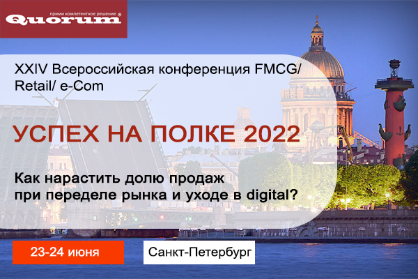 | UPGRADE | Деловые мероприятия для ритейлеров | | | 23-24 июня 2022 года пройдет XXIV Всероссийская конференция УСПЕХ НА ПОЛКЕ 2022 «Как нарастить долю продаж при переделе рынка и уходе в digital?» | | | | Вы узнаете о последних изменениях, тенденциях и прогнозах на рынке FMCG, ознакомитесь с докладами аналитических компаний, обсудите вопрос «что делать?» с ведущими игроками. Вы получите ценный опыт, поймете, как выжить на падающем рынке, а также узнаете, как нарастить долю в условиях передела рынка. | | | | Какие темы будут обсуждаться: | | | - Что происходит на рынке FMCG и в ритейле прямо сейчас?